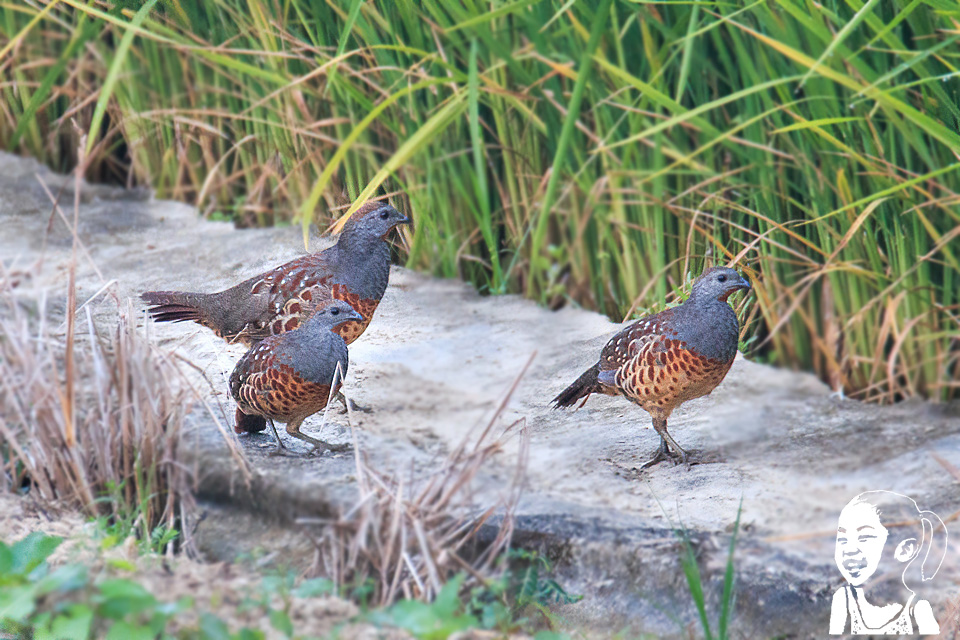 鄉村的清晨很寧靜,空氣很清新! 慢慢地,當天共有五隻竹雞走出來逛了,一旁是即將成熟的稻榖,也是竹雞的食物之一! 竹雞跑步的速度可真快,吃飽飯沒多久,這成群的竹雞就跨越過休耕的大大農地,到另一端的竹林中去了!